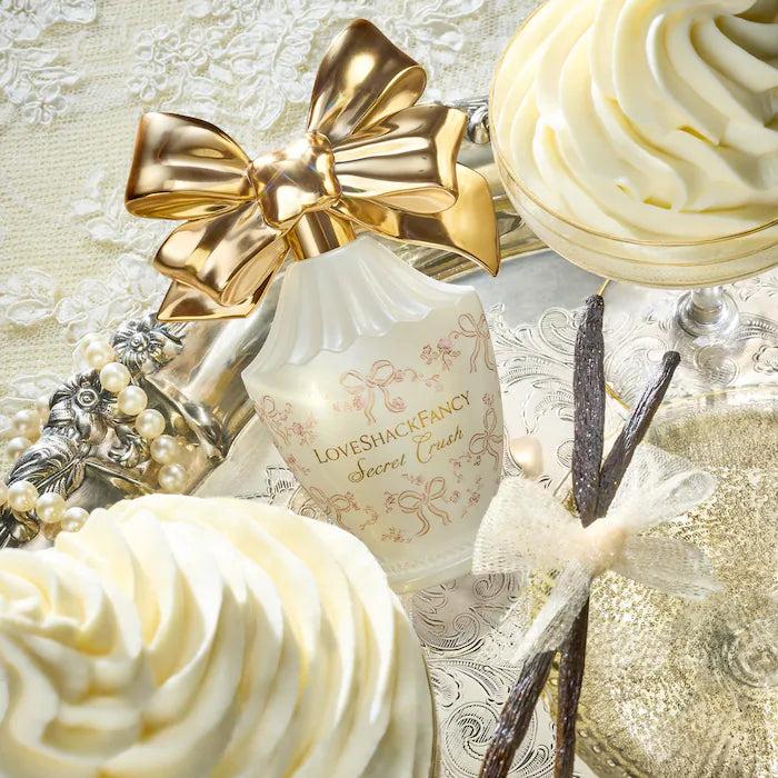 A luminous, whipped vanilla dream. Secret Crush captures a fluffy, feminine fantasy—creamy vanilla meets sparkling champagne and frosted Chantilly for a scent that feels like pure joy. Soft yet lasting, it lingers with comforting notes of white musk, coconut milk, and sandalwood for a glow that stays all day.
