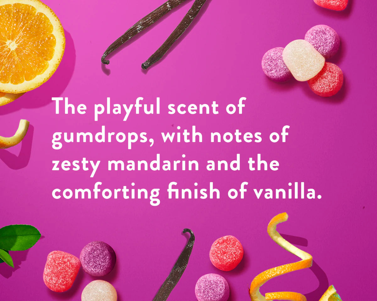 Celebrate the season with Holiday Gumdrop, a bright, playful blend of mandarin, juicy nectar, peony, and vanilla. Sweet yet sophisticated, this scent captures the fun of festive treats with a soft, creamy finish that feels warm, familiar, and full of sparkle.