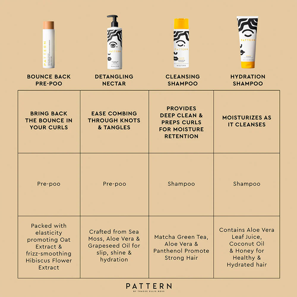 Bring your curls back to life with Pattern’s Bounce Back Pre-Poo, the ultimate pre-shampoo treatment designed to help heat-styled or straightened hair reclaim its natural bounce.