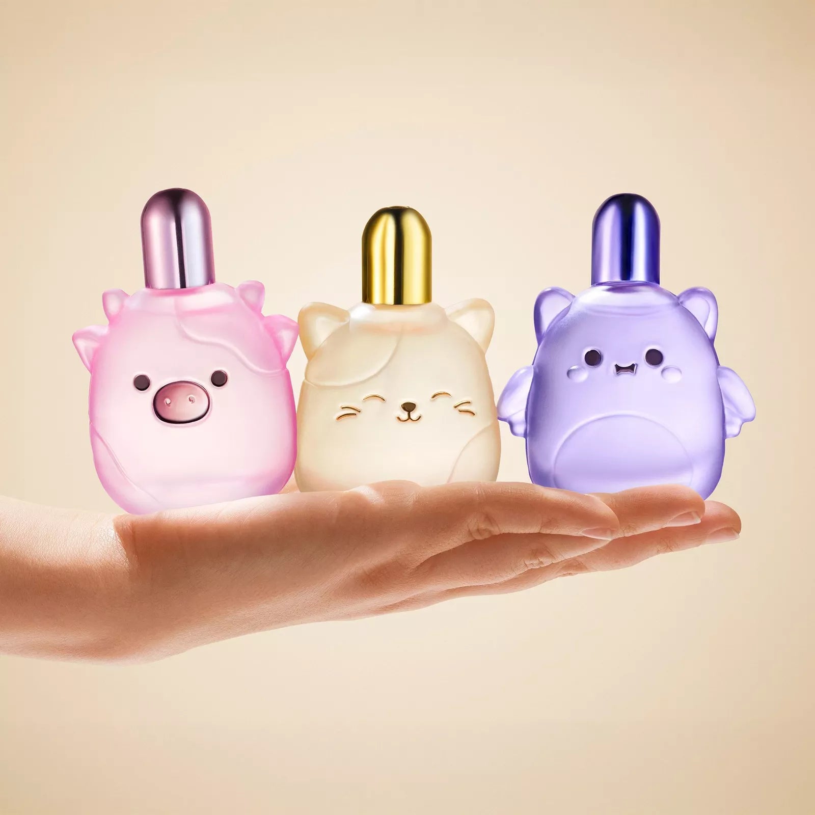 Inspired by your favorite Squishmallows, these mood-boosting scents blend sweet, fluffy marshmallow notes with EmotiWaves™ technology to spark happiness and comfort. Each 3.4 oz bottle includes three interchangeable caps: a travel cap, a classic atomizer, and a collectible bulb sprayer.